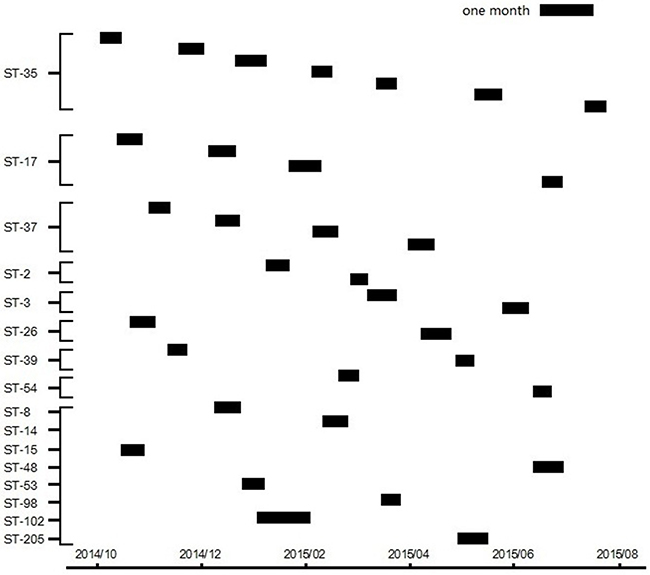 All bacterial colonies for each stool specimen were identified. Bacterial genomic DNAs were extracted using DNeasy Blood & Tissue kit (QIAGEN, Inc., Valencia, CA) according to the manufacturer’s instructions. A multiplex real time PCR assay provided by the UK Bio company in Hangzhou was used for detection of the two toxin genes (tcdA and tcdB) in order to determine between non-toxigenic and toxigenic isolates. Seven housekeeping genes (adk, atpA, dxr, glyA, recA, sodA, and tpi) selected based on a previous study by Griffiths et al. were used for multilocus sequence typing (MLST) [38]. After the standard procedure of PCR, the amplified products were sequenced. Data was uploaded into a public C. difficile MLST database, accessible at http://pubmlst.org/cdifficile, for determining sequence types (ST). The eBURST was used to identify clonal complexes, each of those are defined by one of the seven typed genes, which bear different features from one another. Minimum spanning tree that reveals the allelic difference between isolates of the seven housekeeping genes was constructed by application of Bionumerics software (Applied Math). The Simpson’s index of diversity (D value) was calculated with an in-house program, MLEECOMP package.
