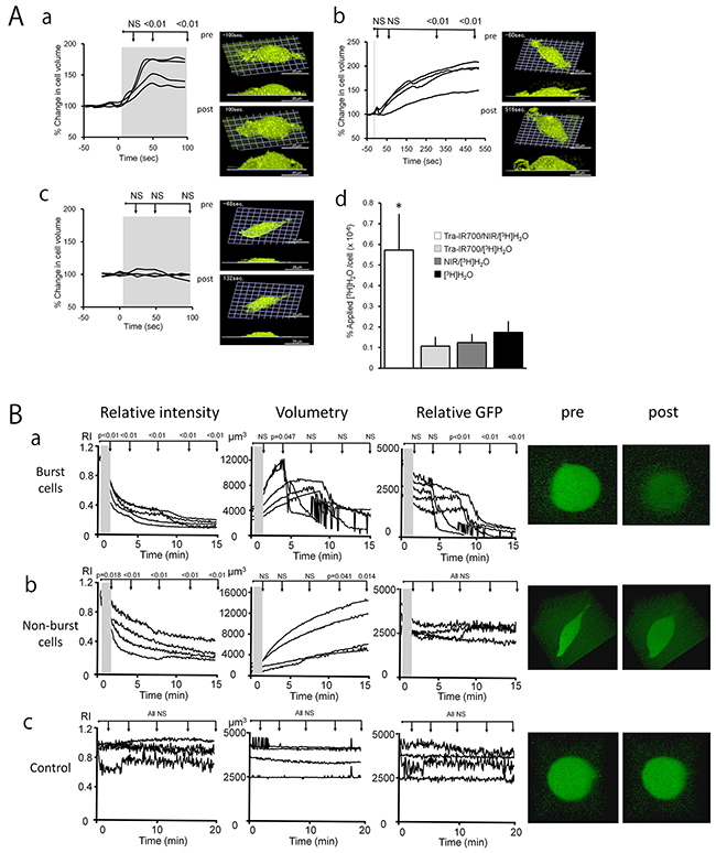 Figure 1: The cells swelled during NIR-PIT. A. a-c, The time course of % change in cell volume during NIR-PIT calculated by 3D LC-QPM and representative images pre- and post- treatment. 3T3-HER2 cells were treated with Tra-IR700 for 24 hr before 3D LC-QPM observation. The gray area in each graph represents the NIR light exposure duration (a: continuous exposure, b: 5-sec exposure, c: continuous exposure in 50 mM dextran). Cells began to swell shortly after exposure to NIR light excitation and reached a maximum within 1 min (a). Cell swelling was observed even after only 5-sec exposure of NIR light (b). Cell swelling was not observed after NIR light exposure in 50 mM dextran (c). d, 3T3-HER2 cells were incubated in culture medium with [3H]H2O to investigate the water flow-in during NIR-PIT. Uptake of [3H]H2O was significantly higher in NIR-PIT treated cells compared to non-treated cells (P < 0.05). B. The time course change in GFP concentration, cell volume, and total GFP amount in cells during NIR-PIT calculated from diSPIM imaging, and representative images pre- and post- treatment. 3T3-HER2 cells were treated with Tra-IR700 for 6 hr before diSPIM observation. The gray area in each graph represents the NIR light exposure duration (a, b: 1-min exposure, c: no exposure). The cells began to swell shortly after exposure to NIR light excitation and half of them burst during observation (a) and half of them continued swelling even 15-min after exposure of NIR light (b). Control cells with no NIR exposure did not show swelling or decreasing concentration of GFP (c). The difference of each parameter at immediately after NIR light exposure, 1, 5, 10, 15, 20, 25 and 30 min after NIR-PIT compared to the starting value, respectively. Differences of P < 0.05 were considered significant.