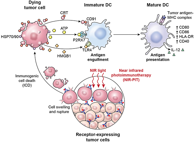 In conclusion, these results indicate that NIR-PIT induces alterations in the cell membrane leading to equilibration of osmotic pressures between the inside and outside of the cell and water flowing into the cell. When the cell volume increases to a critical point, the cell membrane forms blebs and ruptures, thus becoming highly permeable to larger molecules. The release of DAMPs from the cytosol and nucleus triggered by NIR-PIT induces DC maturation (Figure 4). This series of events has been shown to be associated with adaptive immunity, induction of immunologic memory, and promotion of an effective host antitumor immune response, including an abscopal effect at sites distal from NIR-PIT therapy. We are currently testing the impact of NIR-PIT on systemic immunity, including surrogates of ICD, in the first-in-human NIR-PIT clinical trial (NCT02422979). The predictive and pharmacodynamic biomarker data from this trial may assist in optimization of NIR-PIT as a cancer treatment modality for localized disease, and potentially as a component of a multimodality regimen incorporating systemic immunomodulatory therapy.