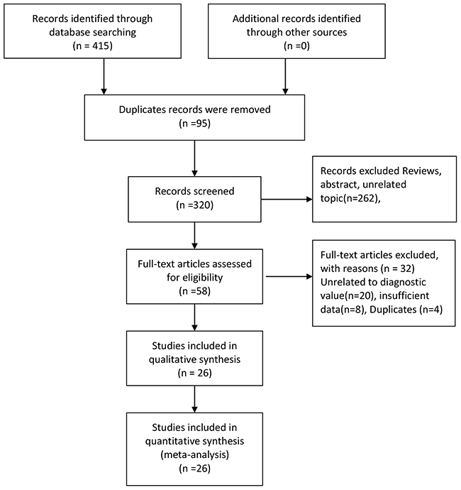 The selection flow of literature search was presented in Figure 1. Our initial search obtained 15 records. 95 duplicates records were removed, and 262 records were excluded after reviewing titles, abstract and topic. 58 full-text articles were assessed for eligibility. With a further work on reading full texts of 58 articles, we removed 20 records unrelated to diagnostic value, and 4 duplicates. Similarly, 8 articles were excluded for unable to provided sufficient data. Finally, 26 articles were entered into the final qualitative and quantitative analyses [3, 5–29].