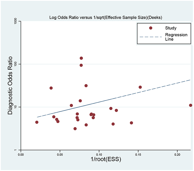 Sensitivity analysis was conducted by sequentially excluding some special studies (with small sample size, bigger cut-off value) [20, 27]. The pooled results did not alter, indicating the results were stable. The Deek’s plot shows there was no publication bias (t=1.670, P=0.107, Figure 6).