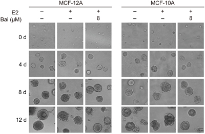 Figure 2: Analysis of the formation of acini in 3D cultures over time. Cells were treated with E2 or E2 plus baicalein (8 μM) for 5 weeks, and were then allowed to grow in Matrigel for 12 days. Images were captured at 0, 4, 8, and 12 days after seeding under a microscope at 400× magnification. The photographs are representative of three independent experiments.