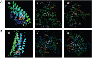The structures of ERα and GPR30 were deposited in the protein databank and were used with SWISS-MODEL to build a homology model (ERα PDB code 3ERT, and GPR30 PDB code 1G50). A molecular docking study was performed using the Sybyl-X 1.2 protocol to analyze the receptor-ligand complexes of baicalein and E2 with the ERα and GPR30 LBDs.