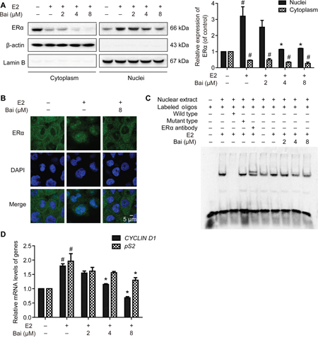 Figure 5: The effects of baicalein on E2-induced ERα nuclear transcriptional activation. After pre-incubation in serum-free medium for 24 h, the cells were treated with E2 or E2 plus baicalein under the same condition for 24 h. A. The localization of ERα in cytoplasmic and nuclear fractions was analyzed by western blotting. The cytoplasmic and nuclear levels of ERα were normalized to β-actin and lamin B, respectively. B. The subcellular localization of ERα was confirmed by confocal microscopy. Images of ERα (green fluorescence) and cell nuclei stained with DAPI (blue fluorescence) are shown (×1000). Scale bar = 5 μm. C. EMSA was used to detect the binding of ERα to estrogen response elements (EREs). The composition of the DNA-binding complex was investigated using anti-ERα antibodies in supershift experiments. The concentration of the unlabeled wild-type or mutant probes (as competitor oligonucleotides) was 100-times greater than that of the labeled wild-type probe. D. The effects of baicalein on E2-induced ERα-regulated gene expression were analyzed using RT-PCR. The results obtained from experiments were normalized to GAPDH expression and are shown as the fold-change compared with control cells. Data are shown as means ± SEM (n = 3). *P < 0.05 vs. E2, #P < 0.05 vs. control.