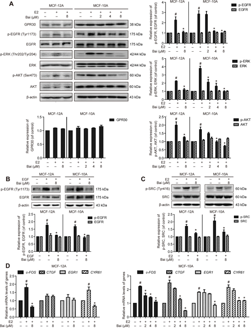 Figure 6: The effects of baicalein on E2-induced GPR30-mediated signal transduction and gene expression. A. The cells were pre-incubated with serum-free medium for 24 h, and were then treated with E2 or E2 plus baicalein under the same condition for 1 h. Western blotting was used to examine the expression of GPR30 and the total and phosphorylated protein levels of EGFR, ERK1/2, and AKT in MCF-12A and MCF-10A cells. β-actin was used as the loading control. B. The cells were pre-incubated with serum-free medium for 24 h, and then treated with 100 ng/ml EGF for 10 minutes in the presence or absence of baicalein, the total and phosphorylated protein levels of EGFR were detected. C. With the treatment condition as (A), the total and phosphorylated protein levels of SRC were analyzed. D. With the treatment condition as (A), the mRNA expression of c-FOS, CTGF, EGR1, and CYR61 was detected using RT-PCR. The results obtained from experiments were normalized to GAPDH levels and are presented as the fold-change compared with control cells. Data are shown as means ± SEM (n = 3). *P < 0.05 vs. E2, #P < 0.05 vs. control.