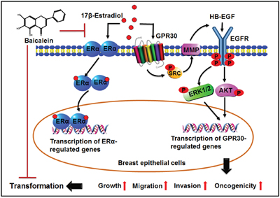 The current results demonstrated that baicalein inhibits E2-induced neoplastic transformation and the cancerous phenotype of the breast epithelium. Moreover, baicalein suppressed the E2-mediated activation of two key regulatory pathways involved in breast carcinogenesis: ERα and GPR30 (Figure 7). Targeting the two pathways simultaneously could represent a novel promising pharmacological approach for the chemoprevention of estrogen-dependent breast cancer that expresses one or both receptors from the onset or following tumor progression. Together, epidemiologic studies, preclinical results, and the positive safety profile encourage the development of baicalein as a potential preventative or therapeutic drug for reducing the risk of breast cancer.