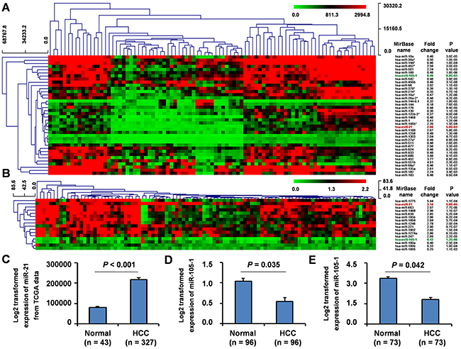 Figure 1: Differential expression of miR-105-1 in HCC using the GEO datasets. Clustered analysis of differential expression of miRNAs (fold change ≥ 2 or ≤ 0.5, P < 0.01) in GSE36915 from GEO database including 68 HCC and 21 non-tumor liver tissues A. and GSE62044-13481 from GEO database including 100 fresh tissues of HCC patients and paired non-tumor liver tissues B. miR-105-1 expression in 327 HCC and 43 non-tumor liver tissues from TCGA data C. GSE22058-GPL10457 from GEO database including 96 pairs of HCC and non-tumor liver tissues D. and GSE21362 from GEO database including 73 pairs of HCC and non-tumor liver tissues E. Normal, healthy controls; HCC, hepatocellular carcinoma. Data shown as mean values with 95% confident intervals. P values were calculated by Mann-Whitney-Wilcoxon test.