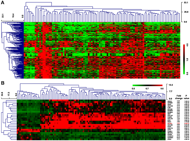 Figure 3: Differential gene expression of HCC using the GEO datasets. A. Clustered analysis of 286 dysregulated genes (FC ≥ 5 or ≤ 0.2, P < 0.001) from GSE62044-GPL6480 data including 100 paired HCC and normal liver samples. B. Clustered analysis of differential gene expression from GSE14323 data, which included 19 normal liver tissues, 41 liver cirrhosis samples, 17 cirrhosis with HCC tissues, and 38 HCC samples. P values were calculated by Mann-Whitney-Wilcoxon test.