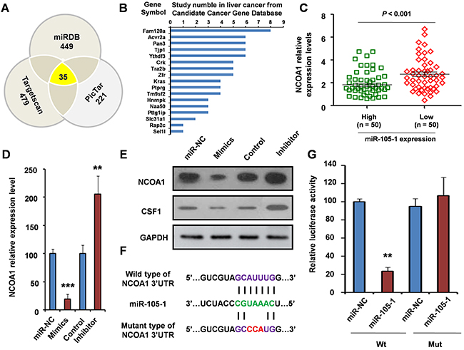 Figure 4: Validation of NCOA1 as a direct target of miR-105-1. A. miR-105-1 target prediction using three target genes prediction programs (Targetscan, miRDB, and PicTar). B. Among 35 common predicted target genes, 17 genes were reported to be involved in liver cancer. C. The relationship of NCOA1 levels with the expression of miR-105-1. Dot plots illustrate median values with 25th and 75th percentiles with whiskers to 10th and 90th percentiles. P values were calculated by Mann-Whitney-Wilcoxon test. qRT-PCR D. and Western blotting E. were used to measure the mRNA and protein level of NCOA1 after treatment of miR-105-1 mimics (overexpression) or inhibitor (knockdown). F. A schematic diagram of the miR-105-1 of 3 ’UTR in NCOA1 binding site and mutation site. G. Luciferase activity assay of pGL3-NCOA1-3’UTR reporter co-transfected with miR-105-1 mimic or miR-105-1-mut oligonucleotides in HeLa cells. Data shown are the means ± SD of three independent experiments. Statistical analyses were performed with one-way ANOVA (** = P < 0.01; *** = P < 0.001).