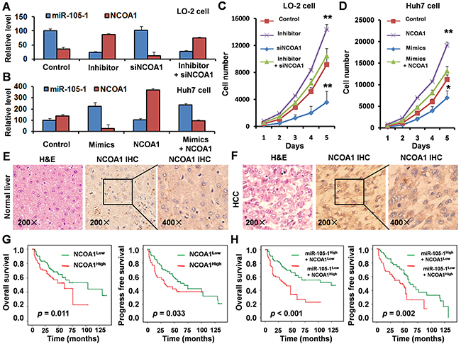 Figure 5: Biological role and clinical significance of miR-105 and NCOA1 in HCC. A. qRT-PCR measurement of the levels of miR-105-1 and NCOA1 mRNA in LO-2 cells treated with negative control, miR-105-1 inhibitor and/or siNCOA1. Data shown are the means ± SD of three independent experiments. B. qRT-PCR measurement of the levels of miR-105-1 and NCOA1 mRNA in Huh7 cells treated with negative control, miR-105-1 mimics and/or NCOA1 expression vector. C. The LO-2 cell counts in 96-well plate after transfection with negative control, miR-105-1 inhibitor and/or siNCOA1 at the indicated day. D. Huh7 cell counts in 96-well plate after transfection with negative control, miR-105-1 mimics and/or NCOA1 expression vector at the indicated day. Data shown are the means ± SD of three independent experiments. Statistical analyses were performed with one-way ANOVA (* = P < 0.05; ** = P < 0.01). Immunohistochemical staining in paraffin sections of 154 paired normal liver E. and HCC tissues F. G. Kaplan-Meier survival analysis was used to evaluate the prognostic value of NCOA1 expression in HCC for OS and PFS. H. Kaplan-Meier survival analysis was used to evaluate the prognostic value of NCOA1 and miR-105-1 expression in HCC for OS and PFS.
