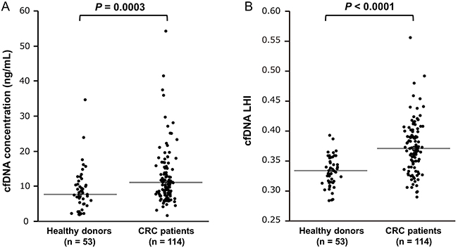Figure 1: Comparison of cfDNA concentration and cfDNA LHI between healthy donors and CRC patients. A. cfDNA concentration of 114 CRC patients was significantly higher than that of 53 healthy donors (Mann–Whitney U test, P = 0.0003). B. cfDNA LHI of 114 CRC patients was significantly higher than that of 53 healthy donors (Mann–Whitney U test, P < 0.0001). The horizontal line represents the median value.