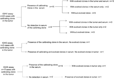 Figure 1: Identification of the calibrating clone and repartition of the different subclones in the tumour and in the plasma with the IGH-V, IGH-D and IGK assays.