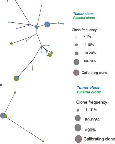 Figure 2: A and B. Two examples illustrating the clonal heterogeneity of FL and the heterogeneous distribution of clonal and subclonal populations between the tumour biopsy and the plasma.