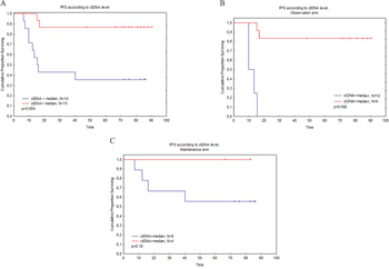 Figure 3: A. PFS according to the level of ctDNA in 29 patients with detectable calibrating clone presence in the tumour. B. PFS according to the level of ctDNA in the PRIMA observation subgroup. C. PFS according to the level of ctDNA in the PRIMA rituximab-maintenance subgroup.