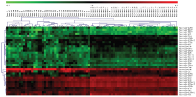miRNAs expression profile of 377 patients were downloaded from TCGA database using TCGA-Assembler [14], specially, 37 paired tumor and non-tumor data were also included. A total of 207 miRNAs were found differently expressed between cancer and non-cancer tissue (student's t test, p<0.05). We got 33-miRNA signature by class prediction and clustering of these paired data using MultiExperiment Viewer v4.2 software. The maximum correct classification rate is up to 98.7% for HCC and noncancerous liver (Figure 1). These 33 miRNAs, in which, 22 were down-regulated and 11 were up-regulated, were listed in Table 1.
