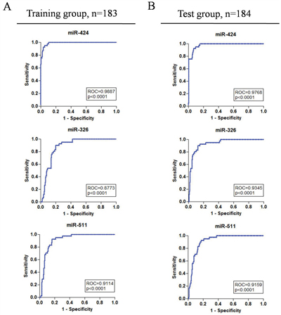 miRNAs are promising biomarkers for cancer diagnosis and prognosis. Increasing studies on miRNAs as biomarkers have been reported. Wei et al. conducted a microarray consisting of 683 miRNAs used in profiling 166 hepatocellular carcinomas in South China, and found 4 miRNAs (hsa-mir-451, hsa-mir-766, hsa-mir-103 and hsa-mir-18a) were potential biomarkers [15]. In another study, an integrated miRNA signature was identified from 26 published HCC datasets, and validated by TCGA database. Three miRNAs were the same with our findings: hsa-mir-214, hsa-mir-145 and hsa-mir-199a [16]. In our study, a 33-microRNA signature was identified to discriminate hepatocellular carcinoma from corresponding noncancerous liver tissues, among which 5 miRNAs (hsa-mir-3677, hsa-mir-421, hsa-mir-326, hsa-mir-424 and hsa-mir-511-2) were identified significantly associated with patients survival. In addition, five miRNAs (miR-424, miR-326, miR-511, miR-125b-2 and miR-451) were identified to provide high diagnostic accuracy of HCC. The main reason might be probably that miRNAs expression profiles varied considerably in different studies due to different technological platforms and sample conditions, like stage and pathological grading.
