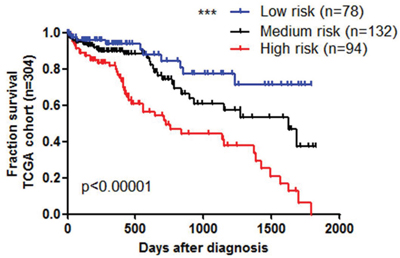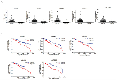 In the survival analysis, patients were stratified into the low risk group and high risk group based on their expression level of the 5 miRNAs which were significantly correlated with patients survival. Higher level was considered as high risk group, lower level as lower risk group. We defined high risk group patients getting 1 score, while low risk group getting 0 score for each miRNA. Therefore, the highest score would be 5, and the lowest score was 0.
