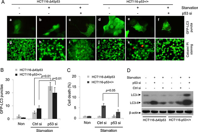 Figure 2: Δ40p53 inhibits starvation-induced autophagy in HCT116-Δ40p53 cells. HCT116-p53+/+ and HCT116-Δ40p53 cells were transfected with a plasmid encoding GFP-LC3 and p53-directed siRNA (p53 si)/control siRNA (Ctrl si) for 24 hours and were then treated by starvation for 48 hours. Non: non-treatment. (A) Immunofluorescence detection of GFP-LC3 puncta (upper panel) and Calcein-AM/PI assay detection of cell death (lower panel). (B, C) Quantification of the number of GFP-LC3 puncta (B) and cell death (C) of (A). Data are presented as the mean ± SEM in three independent experiments. (D) Immunoblot detection using the indicated antibodies.
