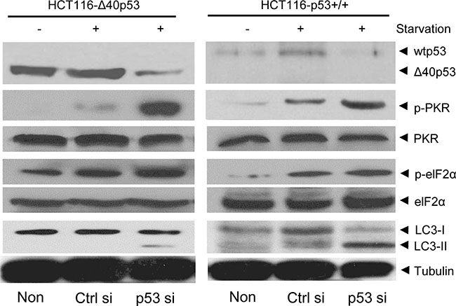 Figure 5: Δ40p53 inhibits the phosphorylation of PKR and elF2α. HCT116-p53+/+ and HCT116-Δ40p53 cells were transfected with p53-directed siRNA (p53 si)/control siRNA (Ctrl si) for 24 hours and were then treated by starvation for 48 hours. Non: non-treatment. Immunoblot detection with the indicated antibodies.
