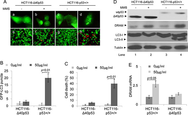 Figure 6: Δ40p53 cannot induce autophagy and cell death in HCT116-Δ40p53 cells in response to MMS treatment. HCT116-p53+/+ and HCT116-Δ40p53 cells were transfected with a plasmid encoding GFP-LC3 for 24 hours and then treated with 50 μg/ml MMS for 48 hours. (A) Immunofluorescence detection of GFP-LC3 puncta (upper panel) and Calcein-AM/PI assay detection of cell death (lower panel). (B, C) Quantification of the number of GFP-LC3 puncta (B) and cell death (C) of (A). Data are presented as the mean ± SEM in three independent experiments. (D) Immunoblot detection using the indicated antibodies. (E) qRT-PCR detection of DRAM mRNA.