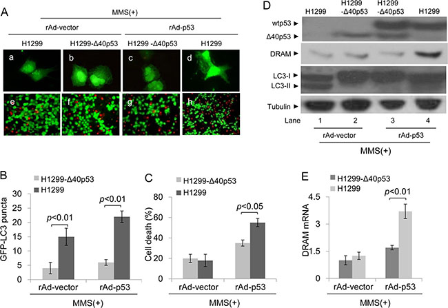 Next, we assessed whether Δ40p53 affects the function of wtp53 in inducing cell death when Δ40p53 and wtp53 co-translocate to the nucleus in response to MMS-induced DNA damage. H1299 and H1299-Δ40p53 cells were infected by recombinant adenovirus carrying wtp53 (rAd-p53) or vector only (rAd-vector) and were then treated with MMS. An immunofluorescence assay showed that MMS or MMS plus rAd-p53 infection induced more GFP-LC3 puncta in H1299 cells than in H1299-Δ40p53 cells (Figure 7A, 7B). These data suggest that Δ40p53 inhibits DNA damage-induced and wtp53-induced autophagy. The Calcein/PI staining assay showed that the proportion of PI+ (dead) cells was significantly lower in H1299-Δ40p53 cell populations than in H1299 cell populations in response to MMS plus rAd-p53 infection, suggesting that Δ40p53 inhibits the function of wtp53 in inducing cell death (Figure 7A, 7C). An immunoblot assay showed that DRAM only increased in H1299 cells treated with MMS plus rAd-p53 infection, and the LC3-II/LC3-I ratio significantly increased in H1299 cells treated with MMS alone or MMS plus rAd-p53 infection (Figure 7D). The qRT-PCR assay further showed that the level of DRAM mRNA in H1299-Δ40p53 cells was significantly lower than that of H1299 cells in response to MMS plus rAd-p53 infection, suggesting that Δ40p53 inhibits the transactivation activity of wtp53 in inducing DRAM expression (Figure 7E).