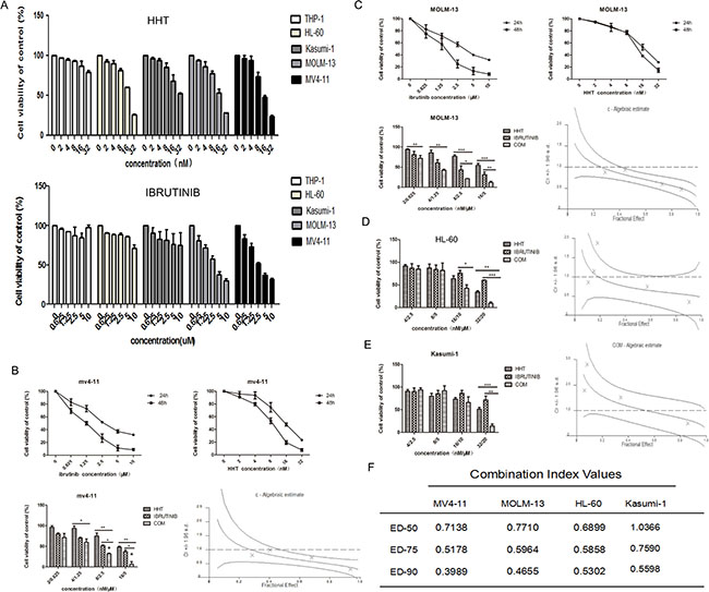 Figure 1: HHT and ibrutinib inhibit the growth of AML cell lines. The cell viability induced by HHT and ibrutinib in AML cell lines at 24 h (A). The rate of cell viability induced by HHT, ibrutinib and HHT+ibrutinib in MV4-11cells (B), MOLM-13 cells (C), HL-60 cells (D) and Kasumi-1 cells (E) was measured by a MTT assay. The CI at the ED50, ED75 and ED90 were presented (F). The data are presented as mean inhibition rates ±SD from at least three independent experiments.