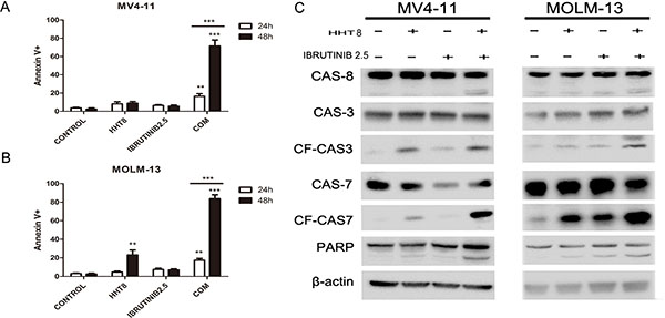 Figure 3: Apoptosis induced by HHT, ibrutinib and HHT + ibrutinib in FLT3-ITD mutant cells. (A) MV4-11 and MOLM-13 cells (B) were treated with 8 nM HHT and/or 2.5 μM ibrutinib for 24 h and 48 h. Cells were co-stained with Annexin V and PI and apoptosis was measured by flow cytometry. Expression of PARP, caspase-3, -7 and -8 were analyzed by Western blotting analyses in MV4-11 and MOLM-13 cells treated with HHT and/or ibrutinib at the indicated concentrations for 24 h (C).