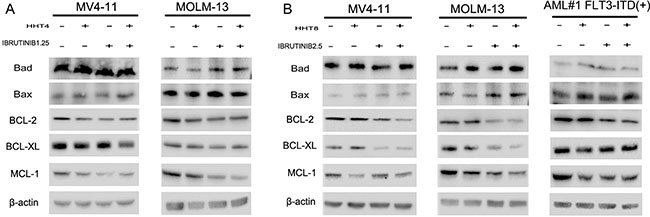 In this study, we investigated if these two drugs could synergistically induce apoptosis of FLT3-ITD mutant AML cells. Cells were exposed to 8 nM HHT and/or 2.5 μM ibrutinib for 24 h and 48 h. Compared with single agents, combination of HHT and ibrutinib resulted in a significant increase in apoptosis of MV4-11 and MOLM-13 cells (Figure 3A and 3B). Next, we analyzed the key signaling molecules in the apoptosis pathway by western blot analysis. As presented in Figure 3C, we observed that the combined treatment obviously increased the expression of cleaved PARP, caspase 8, caspase 7 and caspase 3 at 24 h. The expression of apoptotic proteins Bad and Bax had no obvious change. The expression of main anti-apoptotic proteins including Bcl-2, Bcl-XL and MCL-1 were more significantly decreased caused by HHT combined with ibrutinib after 6 h exposure (Figure 4A and 4B).