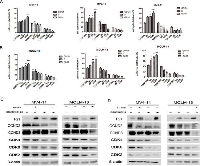 Figure 5: Effects of HHT, ibrutinib, HHT+ibrutinib on cell cycle distribution in AML cells. (A) MV4-11 and MOLM-13 cells were treated with 4 nM HHT and/or 1.25 μM ibrutinib for 24 h. (B) MV4-11 and MOLM-13 cells were treated with 8 nM HHT or/and 2.5 μM ibrutinib for 24 h. The cells were stained with propidium iodide and subjected to flowcytometry analysis to determine cell cycle distribution. (C and D) Soluble proteins P21, CCDN2, CCDN3, CDK4, CDK6, CDK2 and β-actin were analyzed by Western blotting analyses at the indicated concentrations for 24 h.