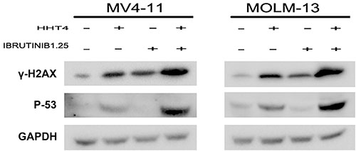 P53 is the upstream of P21WAF1/CIP1. In our study, we found that HHT obviously increased P53 and the combination of HHT and ibrutinib resulted in a more pronounced increase of P53 on the protein level. In order to investigate whether the up-regulation of P53 was dependent on DNA damage, we examined the level of γH2AX. As shown in Figure 6, we found the combination group increased γH2AX more significantly than single agents. These data indicated that the up-regulation of P53/P21 was dependent on DNA-damage response.