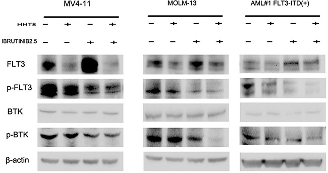 HHT and ibrutinib synergistically induced apoptosis of FLT3-ITD (+) AML cells