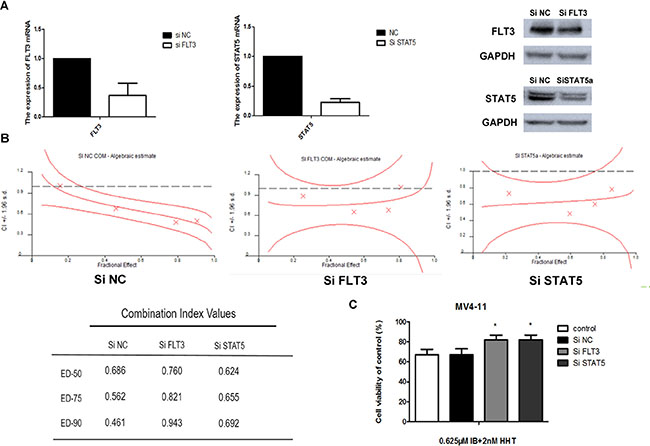 To test the synergistic effects between ibrutinib and HHT whether due to interfere to FLT3 or STAT5, we knocked down the expression of the FLT3 or STAT5 gene in MV4-11 cells using siRNA technology. The reduction of FLT3 or STAT5 expression was confirmed by qPCR and western blotting (Figure 9A). Knockdown cells then were treated with increasing concentrations of ibrutinib and HHT for 24 h. CIs at the ED50, ED75 and ED90 are presented at Figure 9B. We found that there was almost no difference between STAT5-knockdown cells and scrambled siRNA control cells. The CIs of FLT3 knockdown cells were increased compared to the scrambled siRNA control cells. When cells were treated with 0.625 μM ibrutinib and 2 nM HHT for 48 h, compared to control siRNA treatment, the cell viability was increased in FLT3 or STAT5-knockdown cells (P < 0.05) (Figure 9C). These observations suggest that synergy of ibrutinib with HHT is dependent of FLT3 but not STAT5.