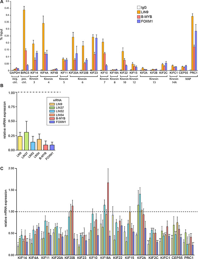 To gain insight in regulation of mitotic kinesin expression in breast cancer cell lines by MMB and FOXM1, we performed chromatin immunoprecipitation (ChIP) assays in MDA-MB-231 breast cancer cells. We used antibodies specific for either the MuvB core subunit LIN9 or for the transcriptional activators B-MYB (MYBL2) and for FOXM1. Unspecific IgG was used as a control. qPCR analysis was used to analyze binding to the promoters of 15 kinesins with suggested functions in mitosis and cytokinesis. We also investigated binding of MMB to the promoters of CEP55 and PRC1, two microtubule-associated non-motor proteins (MAPs) that like the mitotic kinesins also regulate the microtubule network during mitosis. As expected LIN9, B-MYB and FOXM1 bound to the BIRC5 promoter, a validated MMB target gene [4], which was used as positive control (Figure 1A). The GAPDH2 promoter was used as negative control and displayed only a basal enrichment. LIN9, B-MYB and FOXM1 strongly bound to the promoters of 8 of 15 mitotic kinesins (KIF14, KIF20A, KIF11, KIF4A, KIF20B, KIF23, KIF10, KIF22) and to the PRC1 promoter. All three proteins also moderately bound to the promoters of CEP55, KIF15, KIF2C and KIFC1. Consistent with these data, CHR elements have previously been identified in the promoters of mitotic kinesins [32] and the mitotic kinesins were predicted to be targets of MMB and FOXM1 in a recent meta-analysis [19]. Although binding of MMB and FOXM1 to the KIF18 promoter has previously been observed in T98G cells, and a CHR element has been identified in its promoter, no binding was detected in MDA-MB-231 cells [6, 32]. In addition, no binding of MMB and FOXM1 to the promoters of KIF4B, KIF2A and KIF2B was detected. These kinesins have not previously been described as targets of MMB and FOXM1, which is consistent with our ChIP data.