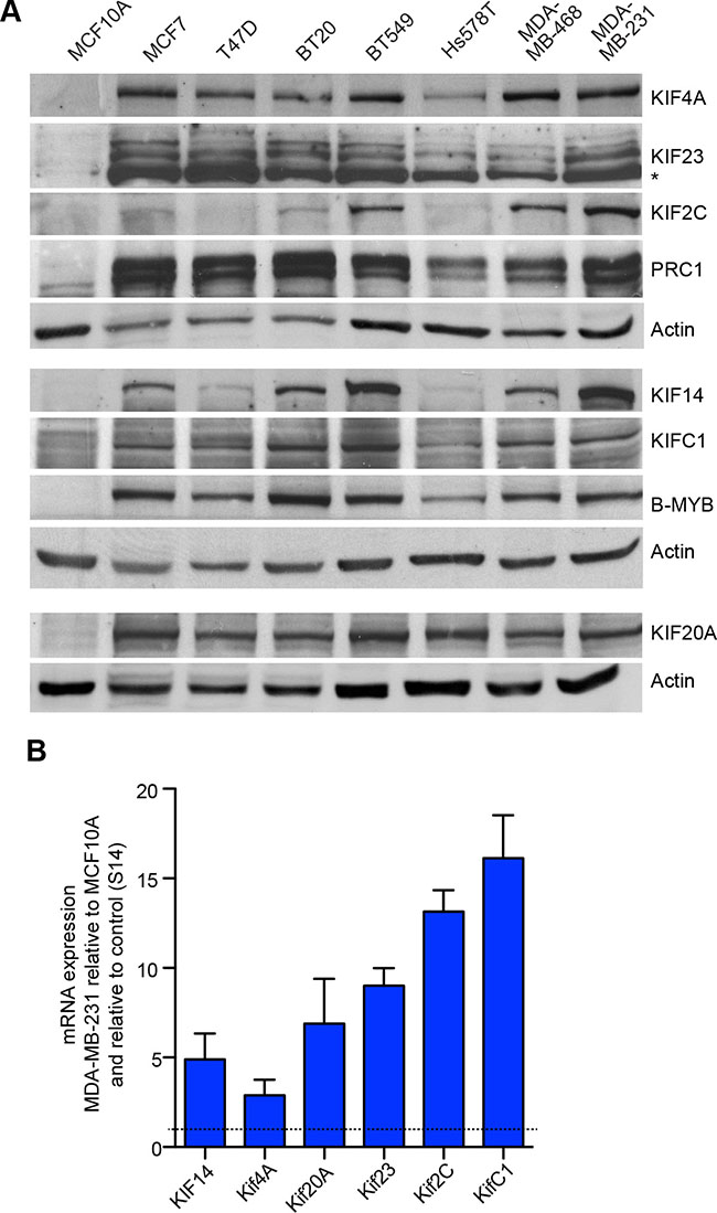 Figure 2: Elevated expression of mitotic kinesins in breast cancer cell lines. (A) Expression of six selected mitotic kinesins and of PRC1 in a panel of breast cancer cell lines compared to MCF10A control cells was analyzed by immunoblotting. Actin was used as a loading control for the corresponding blots. (B) mRNA expression of six selected kinesins and PRC1 was analyzed in MCF10A cells and in MDA-MB-231 cells by RT-qPCR. Expression differences were calculated relative to RPS14. Values are the mean +/– SD of three different experiments.