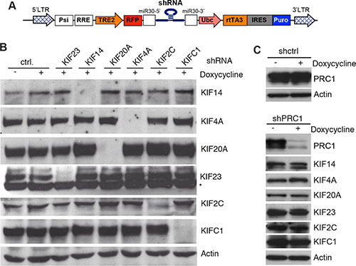 Figure 3: Inducible knockdown of selected mitotic kinesins and PRC1 in MDA-MB-231 cells. (A) Scheme of the pINDUCER vector for doxycycline-inducible expression of shRNAs. (B) Stable MDA-MB-231 cells expressing the indicated inducible shRNAs directed at selected mitotic kinesins were generated. Knockdown of the target of the shRNA after induction of the shRNA with doxycycline for 48 hours was determined by immunoblotting. Actin was used as a loading control. (C) Stable MDA-MB-231 cells expressing a shRNA specific for PRC1 were generated. Expression of PRC1 and the indicated kinesins after induction of the shRNA with doxycycline for 48 hours was determined by immunoblotting. Actin was used as a loading control.