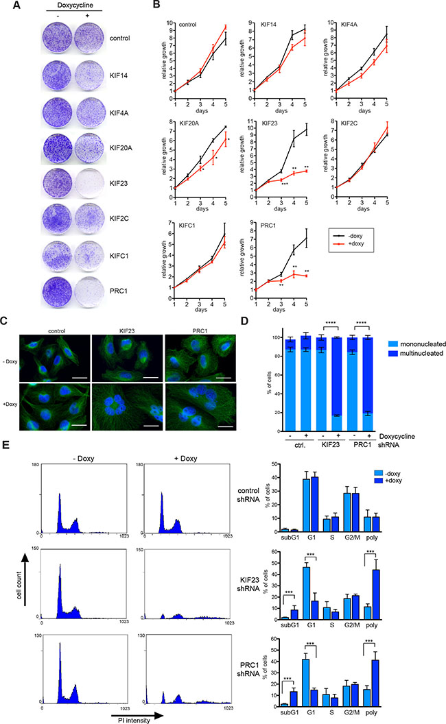 Figure 4: KIF23 and PRC1 are required for proliferation of MDA-MB-231 cells. (A) Colony formation assay. MDA-MB-231 cells stably transduced with the indicated inducible shRNA constructs were plated at low density. Colony formation in absence and presence of doxycycline (to induce the shRNA) was determined by crystal violet staining after 10 days. (B) Growth of MDA-MB-231 cells stably expressing the indicated kinesin-specific shRNAs in presence or absence of doxycycline was analyzed over 5 days. Mean of three independent replicates. Error bars represent standard deviation. Significance levels versus control are indicated. *p < 0.05; **p < 0.001, ***p < 0.0001; Student’s t-test. (C) MDA-MB-231 expressing inducible shRNAs direct at KIF23 and PRC1 were treated with or without doxycycline for 72 hours. Subsequently the cells were fixed and immunostained with tubulin (green) and Hoechst (blue) and investigated by fluorescence microscopy. Bar: 25 μm. (D) Quantification of mononucleated and multinucleated cells upon depletion of KIF23 or PRC1 in MDA-MB-231 cells or after induction of a control shRNA. Error bars represent standard deviation of three biological replicates. Statistical significance is indicated. **p < 0.01, Student’s t-test. (E) The cell cycle profiles of KIF23 and PRC1 depleted cells by doxycycline treatment for 72 hours and of control cells was analyzed by flow cytometry. The percentage of cells in the different phases of the cell cycle was determined. Mean of four different experiments and standard deviation. Statistical significance is indicated. ***p < 0.001, Student’s t-test.