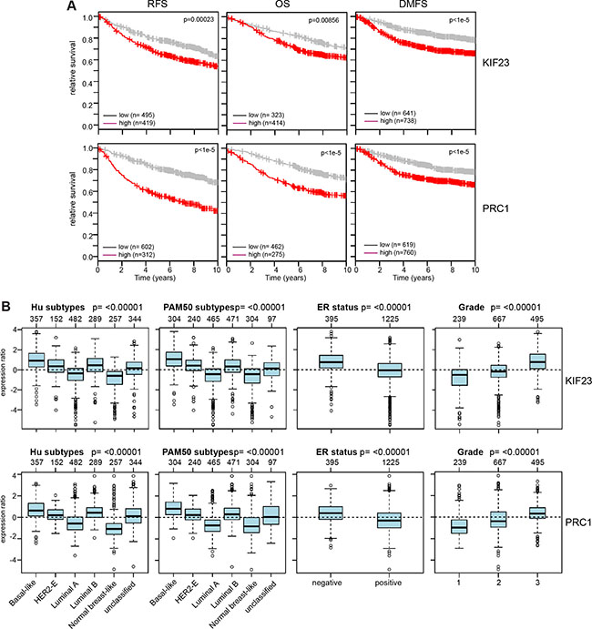 To determine whether these findings are of clinical significance, we asked whether expression of KIF23 and PRC1 is associated with prognosis of breast cancer by examining previously published microarray data sets. Strikingly, tumors with high expression of KIF23 or PRC1 showed a significant shorter relapse-free survival (RFS), overall survival (OS) and distant metastasis free survival (DMSF) compared to tumors with low expression of these genes (Figure 5A). We next examined expression of KIF23 and PRC1 in breast cancer gene expression datasets grouped according to HU and PAM50 subtypes (Figure 5B). Both genes were expressed at higher levels the more aggressive tumor subtypes basal-like and luminal B (Figure 5B). Furthermore, a similar analysis showed that both KIF23 and PRC1 are expressed at higher levels in more aggressive grade 3 tumors compared to grade 1 and grade 2 tumors and in ER-negative versus ER-positive tumors.