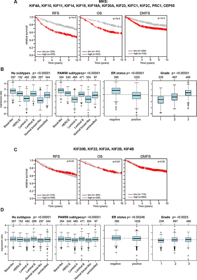 We next interrogated microarray data for a link between the expression of additional mitotic kinesins and the survival of breast cancer patients. This analysis resulted in a list of 12 genes linked to the prognosis of breast cancer which we referred to as the mitotic kinesin signature (MKS). MKS contains the two investigated MAPs (CEP55 and PRC1) and all six mitotic kinesins regulated by MMB and FOXM1. In addition, four additional mitotic kinesins (KIF10, KIF11, KIF18A, KIF15) that were independent of MMB and FOXM1 were also included in the signature. Significantly higher expression of MKS genes was correlated with worse RFS, OS and DMSF in breast cancer patients (Figure 6A). Furthermore, the MKS proteins were expressed at higher levels in more aggressive subtypes (basal-like, luminal B, ER-negative and grade 3 tumors) (Figure 6B). In stark contrast, expression of the remaining 5 mitotic kinesins that are not regulated by MMB and FOXM1 was not correlated with survival and their expression did not strongly differer in specific breast cancer subtypes (Figure 6C, 6D).