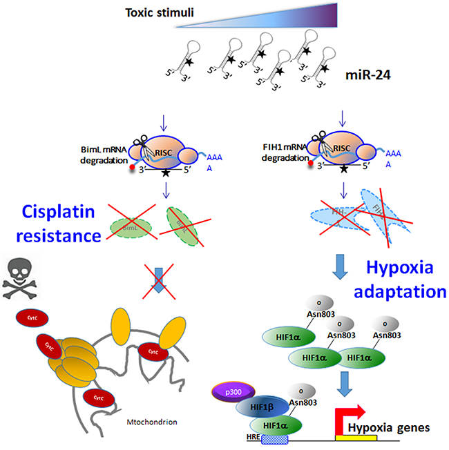 Figure 9: Mechanism of action of miR-24 in breast cancer stem cells. Toxic stimuli induce expression of miR-24. MiR-24 downregulates BimL (inducing resistance to chemotherapeutics) and FIH1 (inducing resistance under hypoxia).