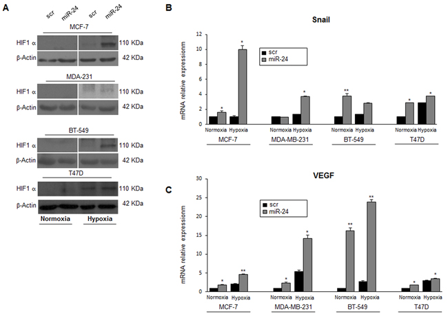 Hypoxia regulates stem cell function through the direct activation of specific HIF target genes. HIF1α plays a key role in many crucial aspects of breast cancer biology, including stem cell maintenance, metabolic reprogramming, EMT, metastasis, and resistance to therapy. Therefore, we investigated miR-24’s effect on the expression of HIF1α. To this end, MCF-7, MDA-MB-231, BT-549 and T47D cells were transfected with either a scrambled oligonucleotide or a pre-miR-24 for 24h and then cultured under hypoxic conditions for 6h. We found that miR-24 upregulated HIF1α expression levels (Figure 5A). Furthermore, expression of two direct HIF1α targets, Snail and VEGFA, were increased (Figure 5B, 5C). These findings suggest that miR-24 induces an adaptive response to the toxic stimulus (i.e., low oxygen) by inducing expression of hypoxia inducible factors.