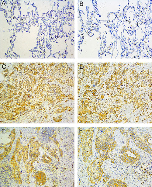 Figure 1: B7-H4 expression in NSCLC. (A, B) normal lung tissue; (C, D) Adenocarcinoma; (E, F) Squamous cell carcinoma. (left: SP ×100, right: SP ×200).