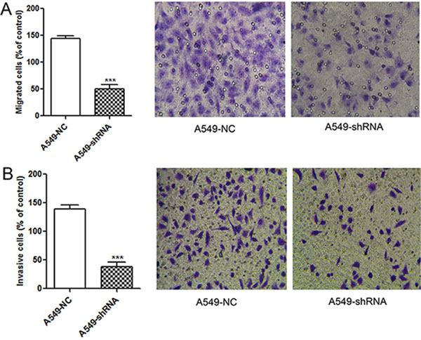 Figure 4: Reducing migration and invasion abilities of A549 cells by lentivirus-mediated RNAi. (A) Effect on tumor migration activity of A549-shRNA cells. A549-shRNA cells and A549-NC cells that migrated through the upper chamber with 8-μm pores membrane were counted and photographed under a light microscope, respectively (SP ×200). (B) Effect on tumor invasion activity of A549-shRNA cells. A549-shRNA cells and A549-NC cells that invaded through the Matrigel coated inserts were counted and photographed under a light microscope, respectively (SP ×200). Data was presented as the mean ± SD; ***p < 0.001.