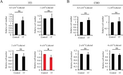 Figure 4: 1 T SMF reduces NIH-3T3 cell number but has minimal effects on CHO cells. NIH-3T3 and CHO cells were plated at different concentrations one day ahead and treated with 1 T SMF for 2 days before they were counted. Relative cell numbers are shown in the figure and quantification was from 3-5 independent experiments. ns, not significant; *, p<0.05. Red color indicates 1 T SMF decreases the cell number.