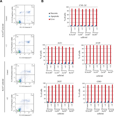 Cells were trypsinized and washed twice with ice-cold PBS before they were resuspended in binding buffer at 106 cells/ml. Then 100 μl of them was transferred to a 5 ml culture tube and 5 μl of FITC-Annexin V + 5 μl of PI (FITC-Annexin V Apoptosis Detection Kit was from BD PharmingenTM) were added to the tube, mixed, and incubated in the dark for 15 min at room temperature. Then, 400 μl of binding buffer was added to the stained cells before they were analyzed by flow cytometry within 1 h. Approximately 1 x 104 cells were collected by flow cytometer. Experiments were done for at least two times and representative results were shown in the figures.