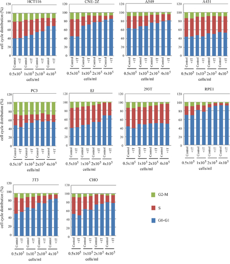 Next we used flow cytometry to examine the cell cycle distribution to see whether the cell number reduction was due to cell cycle arrest at certain stage. However, although the cell density itself has a significant impact on cell cycle distribution in multiple cell lines, 1 T SMF does not have evident effect on cell cycle in all cell lines we tested (Figure 6). These results indicate that the cell number reduction by 1 T SMF we observed in multiple human solid cancer cell lines as well as the mouse embryo fibroblast NIH-3T3 cells at high density was not due to increased cell death or cell cycle arrest.