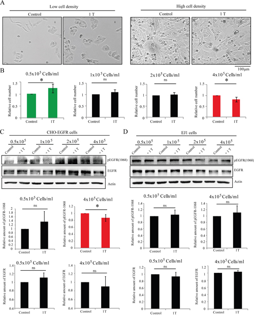 Next we tested whether EGFR can convert the EGFR-null CHO cells (Figure 4) from SMF-insensitive into SMF-sensitive cells by EGFR transfection. We made a CHO cell line that stably overexpresses EGFR with a FLAG tag (CHO-EGFR cells) [4]. Here we examined them for their responses to 1 T SMF at different cell densities. Our results showed that its cell number was reduced by 1 T SMF in a cell density-dependent manner (Figure 8A), which was different from CHO cells (Figure 4), but was similar to many cancer cells we tested (Figure 2). Quantification results showed that at 0.5 x 105 cells/ml, the cell number of CHO-EGFR cells were increased by 1 T SMF (Figure 8B). However, when they were plated at 8-fold higher density (at 4 x 105 cells/ml), the cell number of CHO-EGFR cells are reduced by 1 T SMF (Figure 8B). These results show that transforming EGFR, a protein that is overexpressed and/or activated in multiple cancers, can make the SMF-insensitive CHO cells respond to SMF in a cell density-dependent manner. In addition, Western blot analysis also showed that the EGFR expression level and phosphorylation at 1068 were both increased in cells plated at higher cell densities, which were similar to HCT116, CNE-2Z and A549 cancer cells (Figure 8C). In addition, the EGFR phosphorylation level at higher cell density could be reduced by SMF (Figure 8C). In contrast, the EJ1 cell, which was the only cancer cell line in all 7 solid cancer cell lines we tested that was not reduced by 1 T SMF, showed a different EGFR pattern. The EGFR expression level and phosphorylation level do not increase at higher cell density (Figure 8D). Moreover, the EGFR phosphorylation level of EJ1 cells at higher cell density could not be reduced by 1 T SMF (Figure 8D). Therefore, although we cannot exclude the possible involvement of other cellular factors, for example, other Receptor Tyrosine Kinases that are also overexpressed in many cancer cells, our data show that the EGFR-Akt-mTOR pathway is one of the key factors involved in the SMF-induced differential effects in different cell types at different densities. EGFR is likely to be at least one of the major reasons that contribute to the 1 T SMF-induced cell number reductions in some solid cancer cell lines.