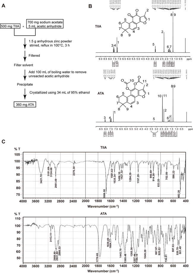 Figure 1: Synthesis of ATA. A. Processes of ATA synthesis. B. 1H NMR spectra of TIIA and ATA. C. FITR spectra of TIIA and ATA.