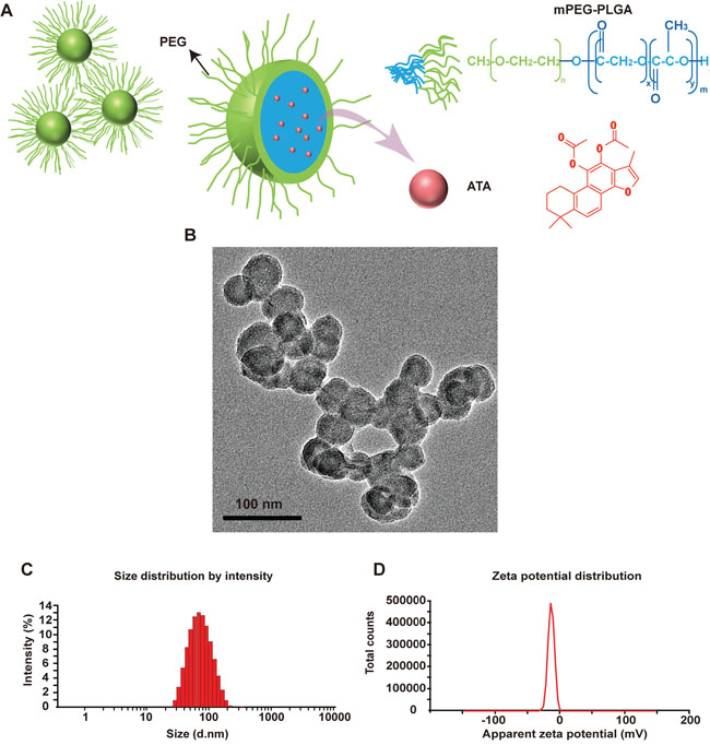 Emulsion-solvent evaporation method was used to prepare the ATA NPs. First, ATA (2.5 mg) and mPEG-PLGA (37.5 mg) were dissolved in chloroform (500 μL). The resultant solution was then added into 0.5% F68 (10 mL) which was dissolved in PBS and treated with ultrasound (37% strength) for 2.5 min. Finally, chloroform was removed by rotary evaporation to obtain ATA NPs. Blank NPs were prepared by the same method, but without the addition of ATA into the formulation.
