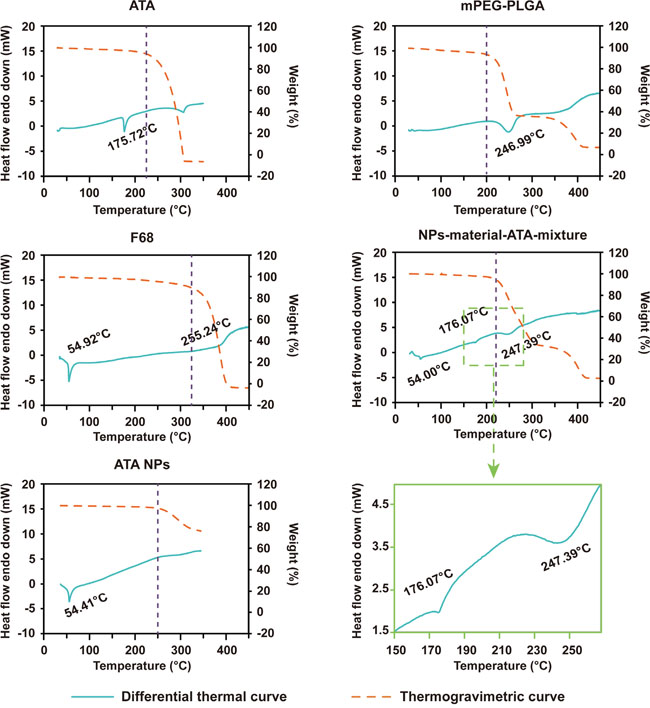 The resulting ATA NPs achieved a high encapsulation efficiency of 88.10% and a good drug-loading rate of 5.54%. The encapsulated ATA molecules were indicated by the TG/DTA analyses to be molecularly dispersed within the NP matrix which confirmed the entrapment of ATA (Figure 3). Moreover, the stability assays showed that ATA NPs remained stable after storage in a physiological saline solution at 4°C and 37°C for 5-7 days. In addition, the release of ATA was significantly prolonged by NP encapsulation.