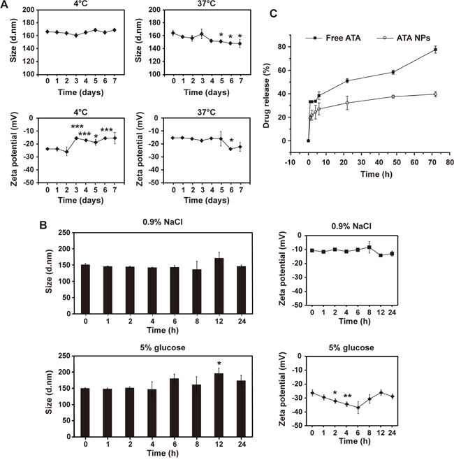 To determine their storage stability, ATA NPs were diluted in phosphate buffered saline (PBS, pH 7.4) and incubated at 4°C or 37°C for 1-7 days. The size and zeta potential of the NPs were measured at designated intervals during this period. To measure the compatibility-stability, ATA NPs were added into solutions of 0.9% NaCl or 5% glucose, and incubated at 25°C for 24 h. From all conditions, 1 mL of suspension was collected for analysis of size and zeta potential.